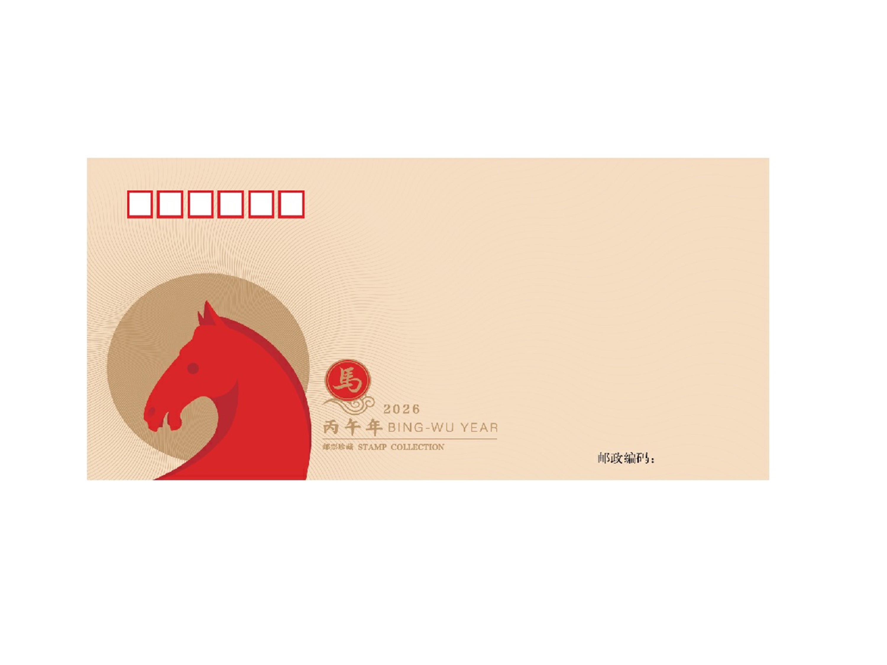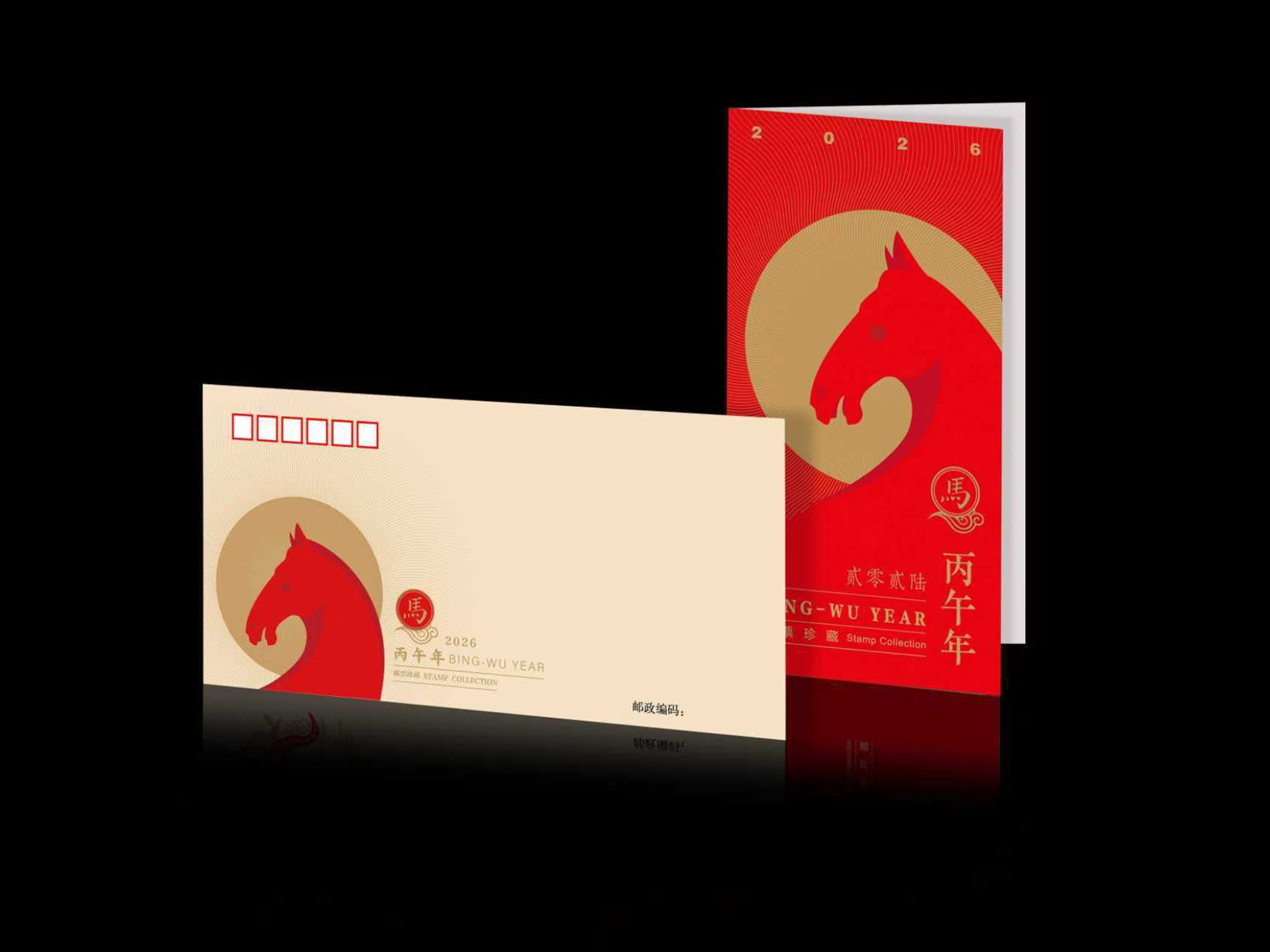 设计说明:2026年农历丙午年,天干“丙”属火,色呈赤;地支“午”同样属火,对应生肖马。本设计紧扣这一主题,以红色作为主调,塑造一匹姿态昂扬的骏马形象。造型采用现代扁平化风格,线条简练,色块鲜明,既呼应传统五行色彩意蕴,亦传递出简约而富有张力的当代审美趣味。