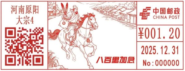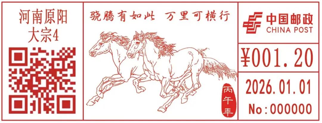 1月1日,新乡市原阳县邮政分公司紧扣岁末年初辞旧迎新的美好寓意,启用了“八百里加急”“马到成功”两枚邮资机宣传戳,推出了加盖“金马张(临)”等文化日戳的特色明信片产品。