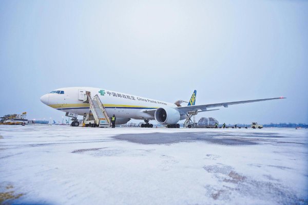 1月19日上午,河南郑州新郑国际机场的飘雪裹着寒意,一架郑州至卢森堡的邮航全货机停靠在机坪。邮航地勤人员穿梭其间,将一板板邮货稳稳装入机舱——这架身披邮政标识的飞机即将带着风雪里的牵挂与年货,沿着国际邮路奔赴远方,成为新春里跨越山海的温暖联结。 □李平 摄