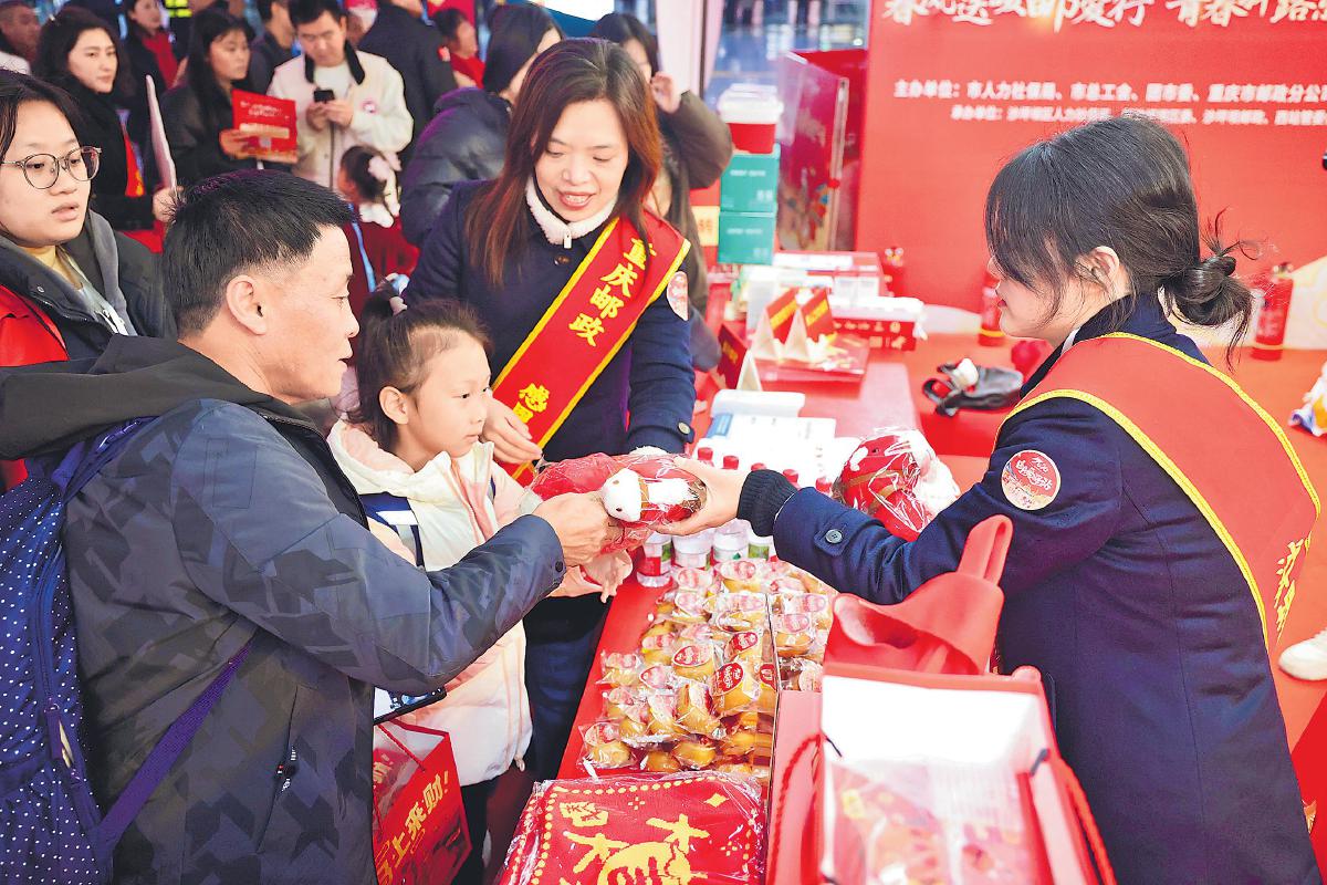 重庆西站“邮爱驿站”里,邮政工作人员向返乡旅客递上马年玩偶并介绍相关惠民服务。