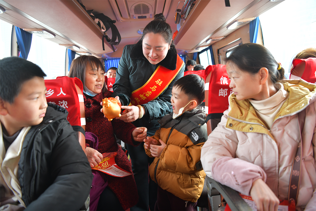 “这是我第三次乘坐邮政的免费大巴回家,一年比一年贴心,不仅省了路费,还能感受到家乡的温暖,太感动了!”从东莞返乡的群众小李接过春联伴手礼,脸上满是幸福的笑容。