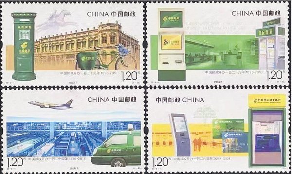 2016年3月20日,中国邮政发行《中国邮政开办一百二十周年》纪念邮票1套4枚(图4),展现了中国邮政的悠久历史及现代化发展。第1枚邮票“信达天下”选用清代邮政天津局旧址、古代驿使雕塑、邮政自行车、邮筒等元素,展现了中国邮政120年的历史画卷,传递了中国邮政“信达天下”的历史使命。第2枚邮票“便民服务”选用邮政服务大厅、便民服务站、易邮柜等元素,表现了中国邮政努力践行“便民服务”的理念。第3枚邮票“速递物流”选用现代化速递物流集散中心、邮运汽车、飞机等元素,凸显中国邮政速递物流方便快捷、安全可靠的优势。第4枚邮票“普惠金融”选用邮政储蓄银行营业厅、ATM机、邮政银行卡(借记卡和信用卡)、中邮保险形象等元素,传达“进步与您同步”的服务理念,凸显“普惠金融”的行业使命。为配合相关纪念活动,中国邮政还利用当年发行的《年年有余》和《喜临门》贺年专用邮票,印制《中国邮政开办一百二十周年纪念》小全张1枚(图5)。