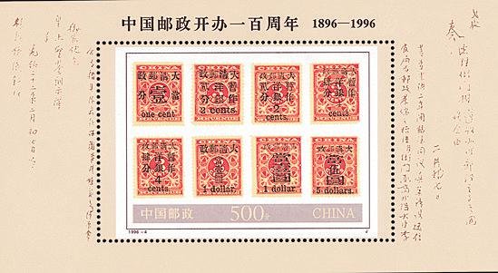 1996年3月20日,中国邮政发行《中国邮政开办一百周年》纪念邮票1套4枚、小型张1枚。4枚邮票(图1)选用清代天津邮政津局旧址、北京邮务管理局旧址、中华苏维埃共和国邮政总局旧址、北京邮政枢纽4座不同时期的邮政建筑为主图,回顾了百年邮政的沧桑,烘托了主题。4座邮政建筑风格迥异,既有民居样式,又有现代化建筑,为了在形式上进行统一,设计者根据建筑外观的特点,在横形票幅的基础上,上下各加一条灰边,图案上方的灰边上印有邮票图名和徽记,下方的灰边摆放国铭、面值、邮票志号等。邮票画面视角开阔,犹如一幅完整的建筑画长卷,体现了韵律美。每枚邮票右上角的邮电徽志与左下角的绿色面值相呼应,强调了邮资凭证的属性。小型张(图2)邮票以分两行排列的全套8枚清红印花加盖邮票为主图,边饰则展示了1896年3月20日清总理衙门议办邮政折及光绪皇帝的“依议钦此”御批。红印花加盖邮票是清代国家邮政开办后发行的第一套邮票,也是世界珍邮,用它作为小型张邮票主图,不仅点明了中国邮政开办百年的纪念主题,也展示了中国珍邮的风采。